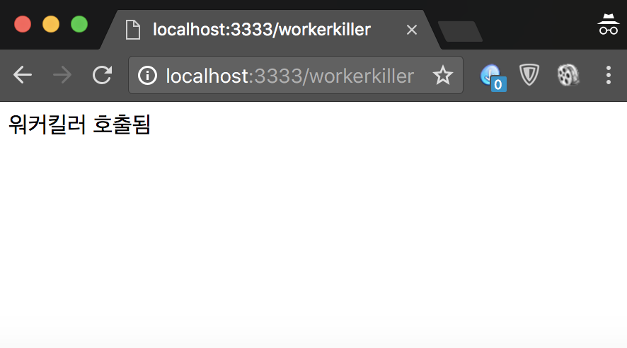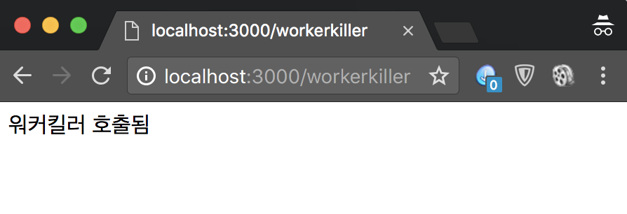 //워커 킬링 테스트 app.get("/workerKiller", function (req, res) { cluster.worker.kill(); res.send('워커킬러 호출됨'); });