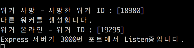 console.log("워커 생성 [" + (i + 1) + "/" + workerCount + "]"); var worker = cluster.fork(); } //워커가 online상태가 되었을때 cluster.on('online', function(worker) { console.log('워커 온라인 - 워커 ID : [' + worker.process.pid + ']'); }); //워커가 죽었을 경우 다시 살림 cluster.on('exit', function(worker) { console.log('워커 사망 - 사망한 워커 ID : [' + worker.process.pid + ']'); console.log('다른 워커를 생성합니다.'); var worker = cluster.fork(); }); //워커일 경우