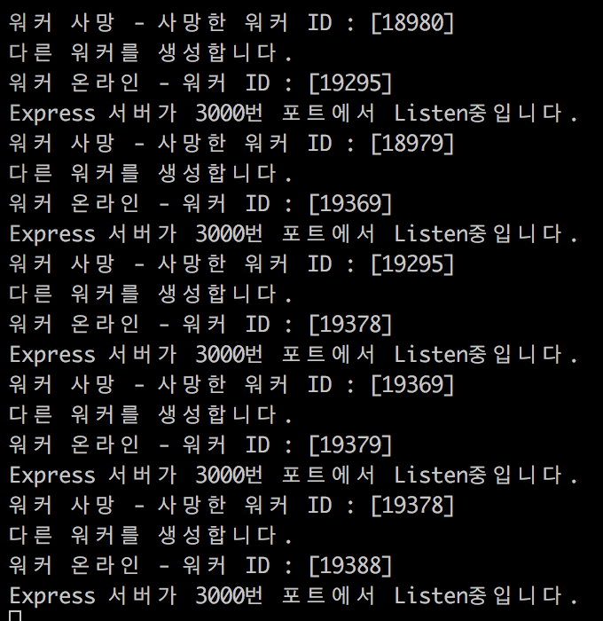 워커 킬러 호출 아래는 호출된 결과입니다. 하나의 워커가 죽자마자 곧장 다른 워커가 태어나(?) 3000번을 Listen하기 시작했습니다.
