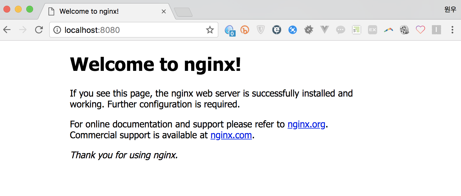 서버 시작 : nginx 서버 중지 : nginx -s stop 서버 재시작 : nginx -r reload (맥에선 이건 안되는듯?)