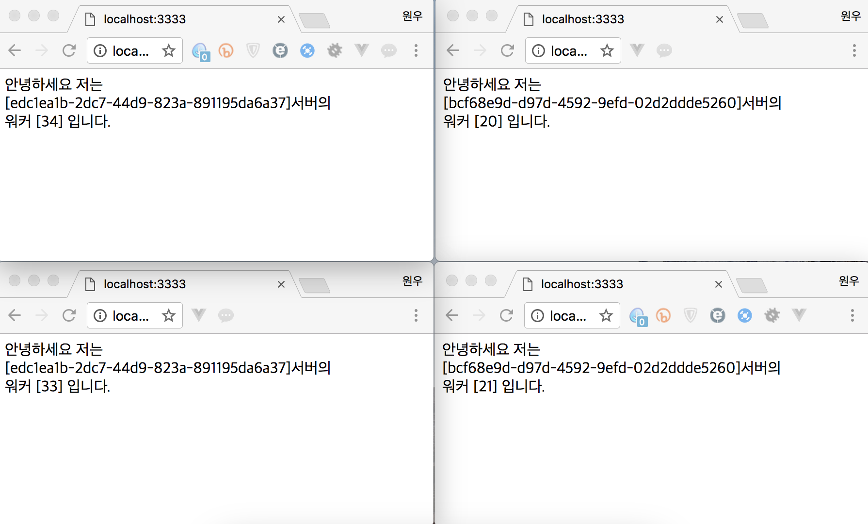 cluster가 적용된 2컨테이너 4서버 구동화면 WOW! 2개의 URL, 2개의 UUID, 각 2명의 워커까지. 완벽한 2.2.2입니다. 마치 홍진호를 보는 듯한 서버 현황입니다. 이제 워커 킬러로 습격해보겠습니다.