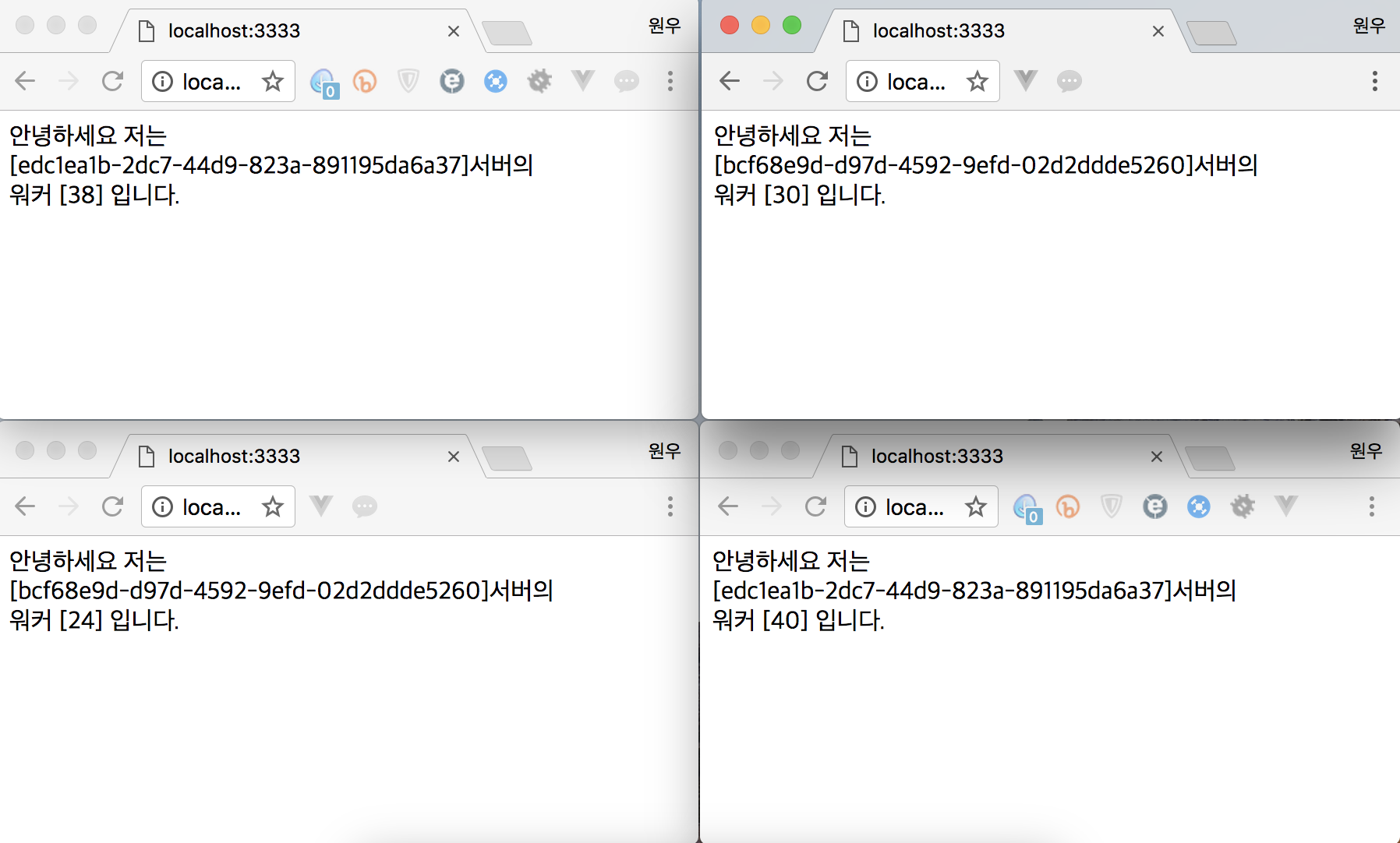 로드밸런싱 적용 이후 모든 브라우저에서 3333번으로 접속했는데 서로 다른 2개의 서버가 번갈아 접속되고, 워커가 가끔 바뀌는 걸 확인할 수 있습니다. 이번엔 로드밸런서로 워커 킬러를 호출하겠습니다.