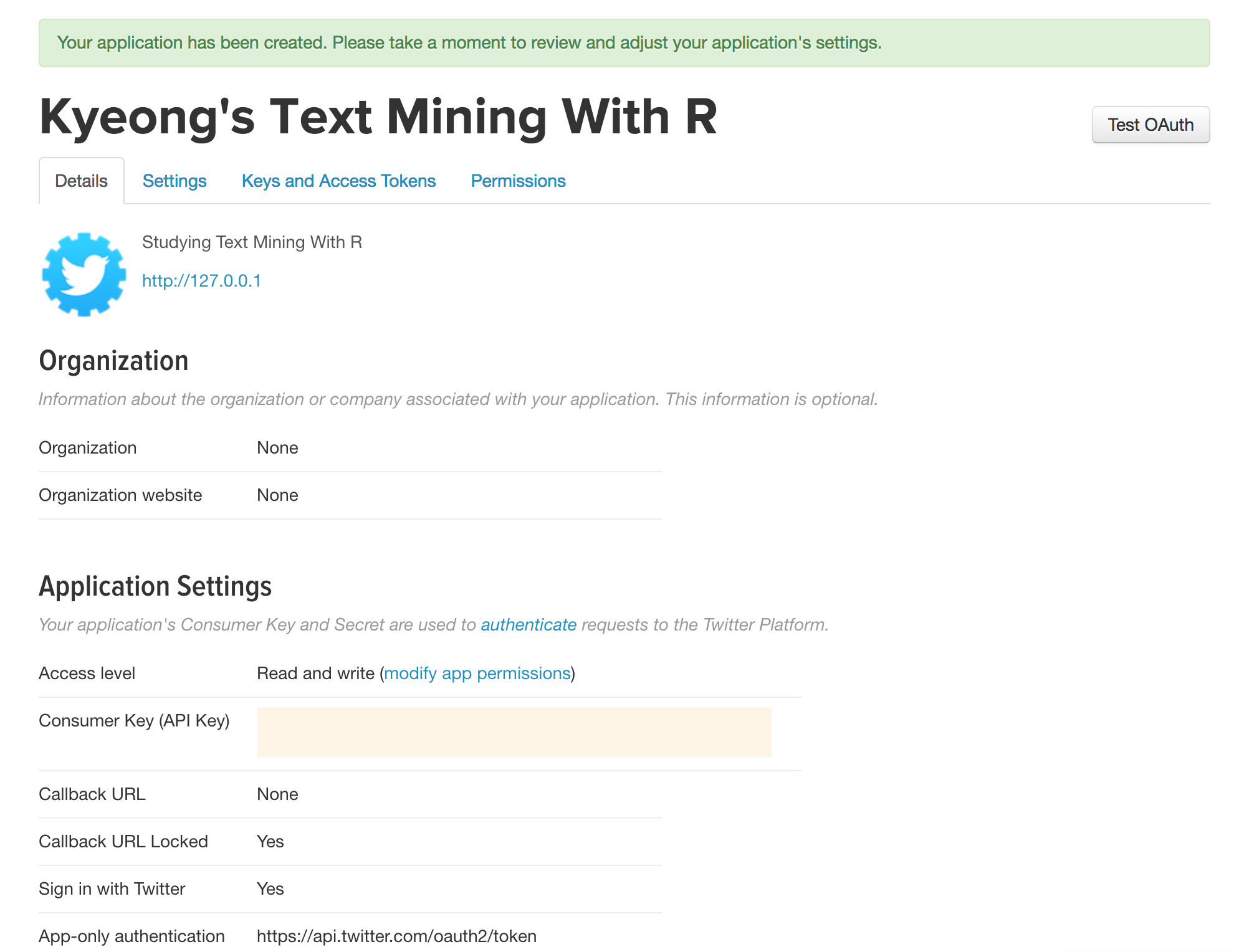 정상적으로 어플리케이션이 등록되면 위의 화면과 함께 API Key를 발급받을 수 있습니다. Consumer Key (API Key) 옆의 내용 (캡쳐화면에는 비공개)을 클릭하면 API Key 뿐만 아니라 API Secret, Access Token 등 세부 내용을 관리할 수도 있습니다.