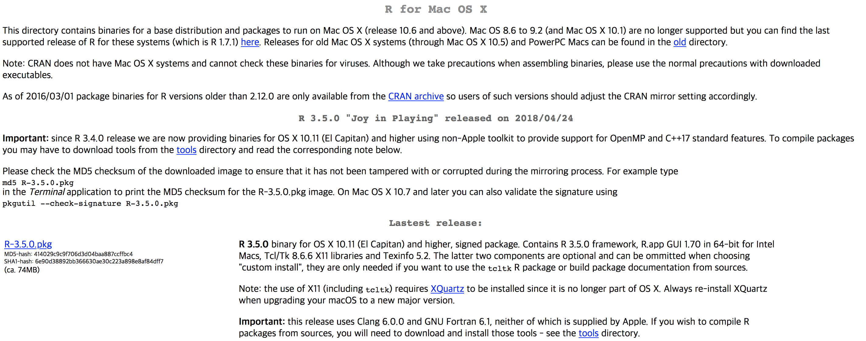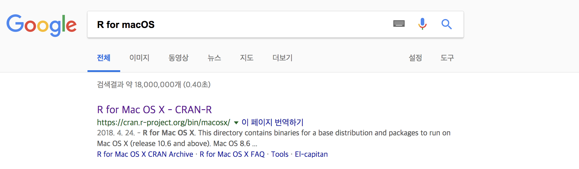 구글에서 R for macOS를 검색을 하면 맨 위에 설치 페이지가 보입니다. 1)