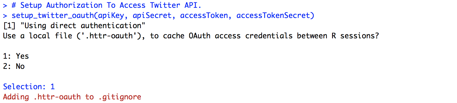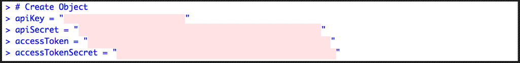 먼저 각자 API 관련 Key 들로 객체를 생성해주고, setup_twitter_oauth() 메소드를 사용하여 Twitter API에 접근합니다.