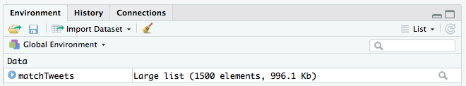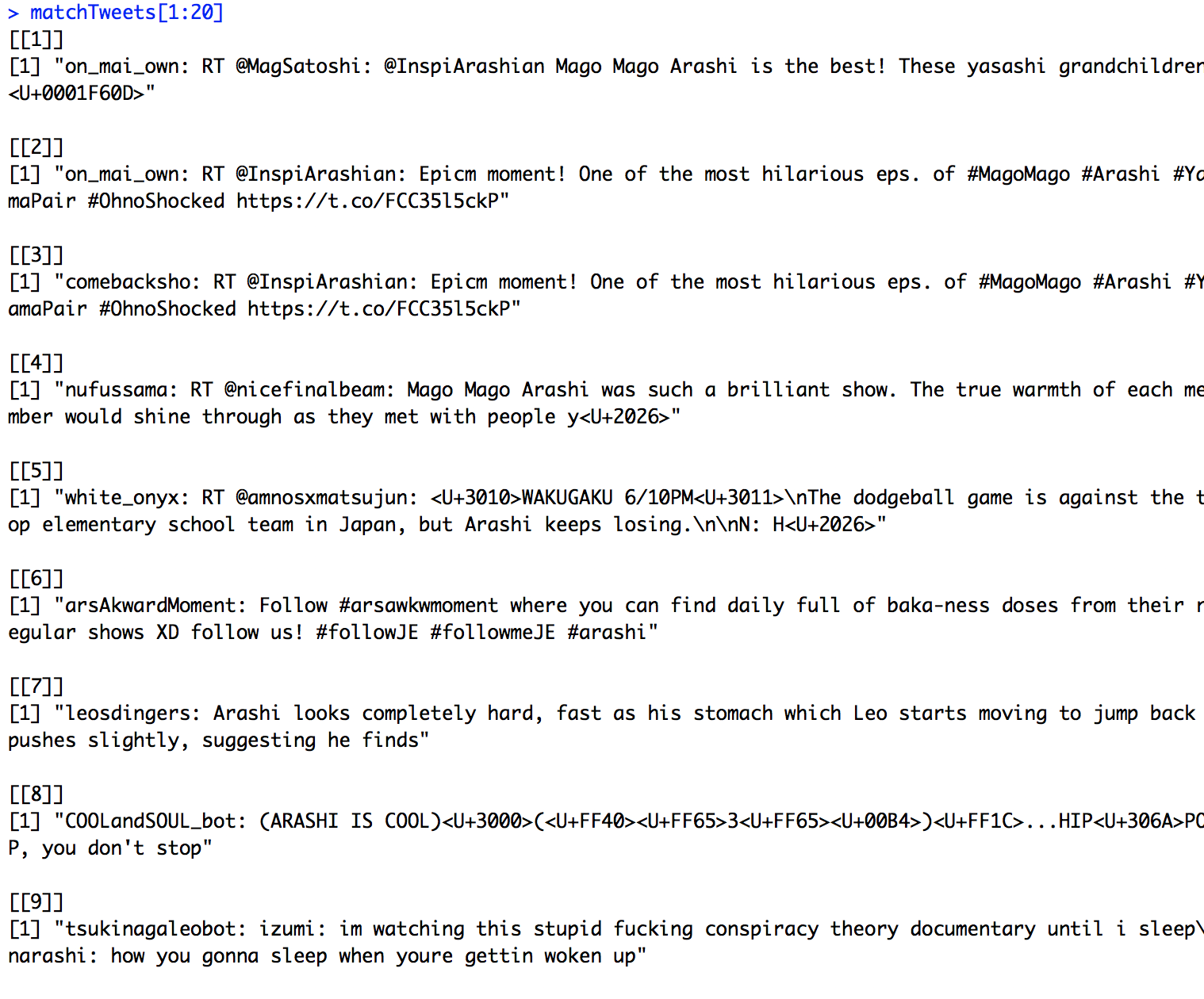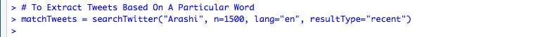 searchTwitter 4) 라는 함수를 사용하면, 트위터 API 를 통해 관련 트윗 내용을 추출할 수 있는데요. 좋아하는 일본 아이돌 가수인 “아라시”를 키워드로 추출하려고 첫 번째 파라미터에 “Arashi”를 넣었습니다. 그 뒤의 내용은 영문으로 작성된 최근(Recent) 트윗을 최대 1500개까지 리턴 받겠다는 의미입니다. resultType에는 popular를 넣으면 가장 인기있는 트윗을 받을 수도 있습니다.