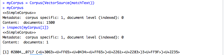 데이터를 Corpus 로 만들 때는 Corpus() 를 사용하면 됩니다. 저는 VectorSource 라는 명령어를 사용해 단어들을 Vector로 바꿔주었고, 데이터가 잘 들어갔는지 확인하기 위해 inspect() 를 사용했습니다.