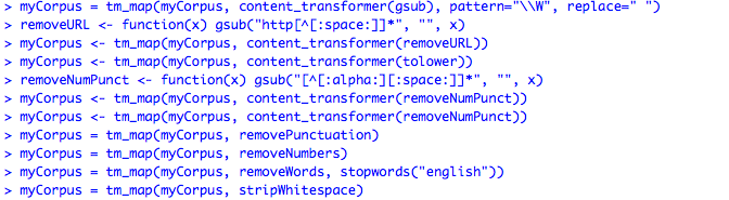 위의 이미지를 보면, 각 행마다 특정 특수문자들을 제거하기 위한 명령어가 있습니다. 중간 부분엔 stopwords 라는 단어가 있는데, 영어 문장에 들어가는 i.e 나 etc 같은 표현들을 제거할 수 있는 겁니다. 그 외에도 대문자를 소문자로 바꾸거나 번호를 제거하는 등의 옵션들이 이미 R에서는 제공되고 있기 때문에, 우리는 입맛에 맞게 가져다 쓰기만 하면 됩니다.
