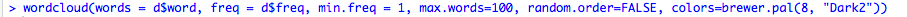 max.words는 최대 N개의 단어를 고르는 옵션이며, min.freq는 최소 N번 이상 나온 단어, random.order = FALSE는 제일 많이 나온 단어가 먼저 나오도록 지정하는 옵션입니다. colors는 지정하지 않으면 검정색으로만 나오지만, 알록달록 예쁘게 표현하고 싶다면 여러 옵션을 지정해서 Frequency 에 따라 다른 색이 나오도록 할 수도 있습니다. 5)