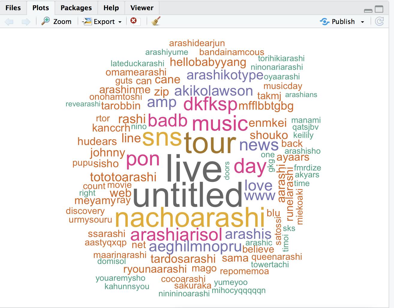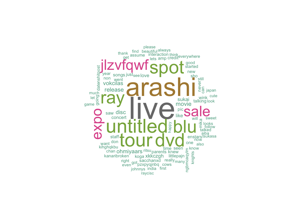 큼직큼직하게 나온 단어들을 보면 DVD 나 블루레이 출시와 관련된 트윗이 대다수인 것을 볼 수 있는데요, 검색 결과 최근 2017-2018 라이브 투어 ‘Untitled’가 출시된 것을 확인할 수 있었습니다. 기타 작게 표현된 단어들을 보면 아라시의 노래 제목들도 확인 가능한데, 이 노래들이 인기있다는 것도 예측할 수 있습니다.