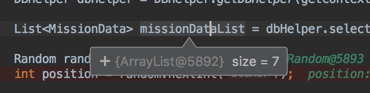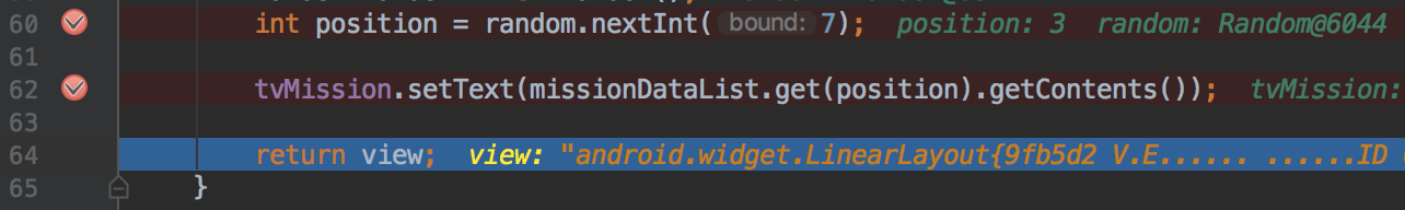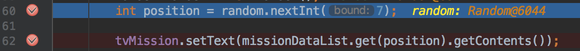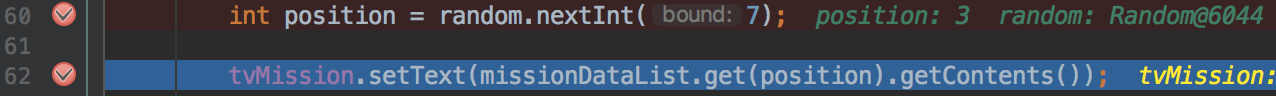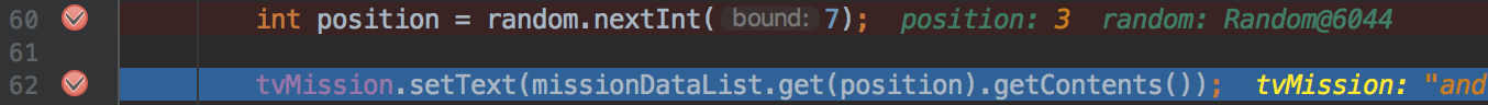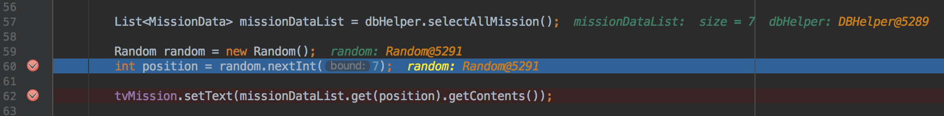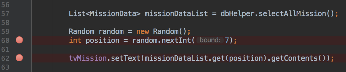 우선 확인하고 싶은 라인에 중단점을 걸어 앱 실행을 일시 중지합니다. 중단점을 거는 방법은 라인 옆의 빈공간을 클릭 하거나 단축키 (Command+F8 / Control+F8)를 클릭합니다. 아래 이미지의 라인 옆의 빨간 점이 중단점입니다.