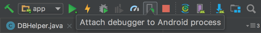 오른쪽 상단의 Attach debugger to Android process를 클릭해 디버깅 모드를 실행할 수 있습니다.