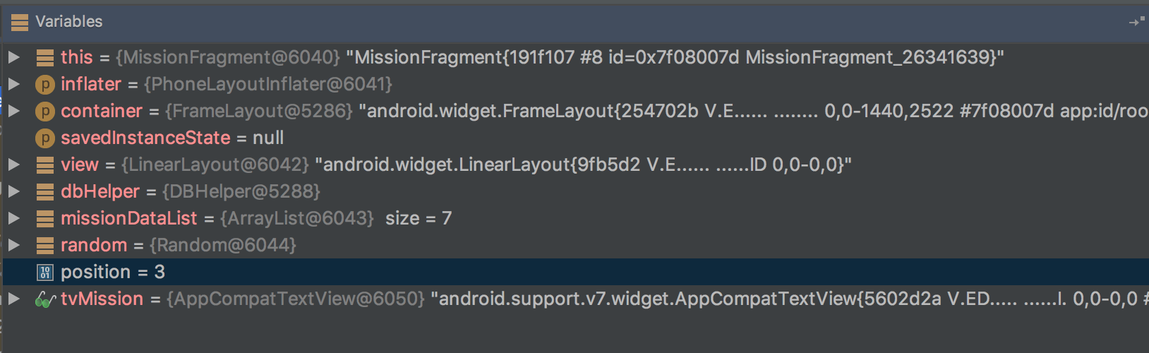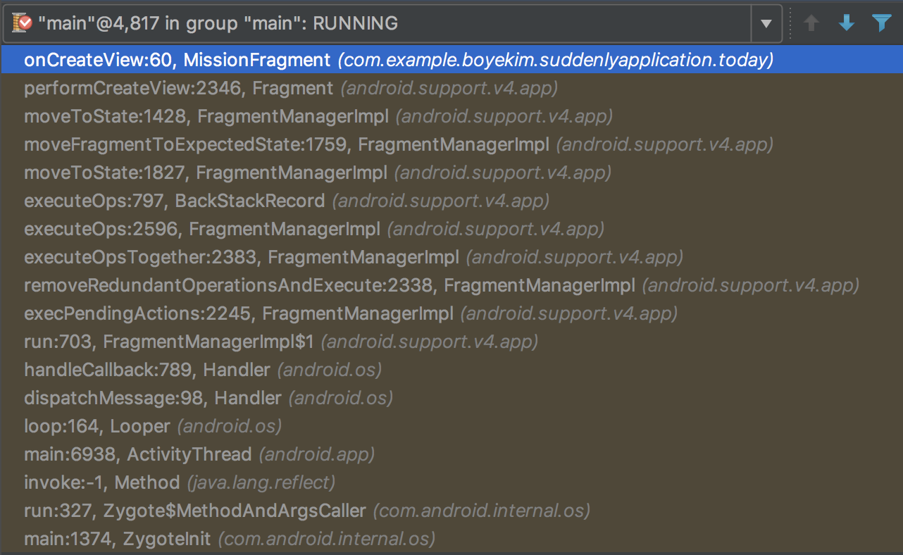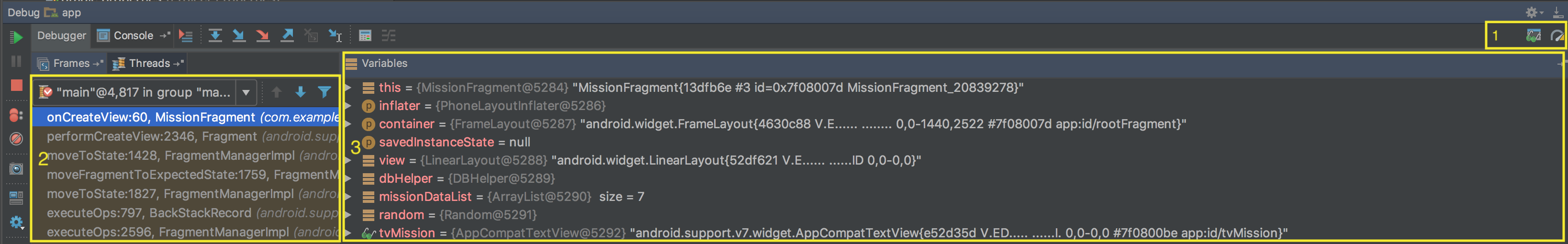 2번 영역은 현재 어느 메서드에 멈춰있는지 알려줍니다. main에서 시작해 run, invoke… onCreateView에 일시중지한 것을 보여줍니다.