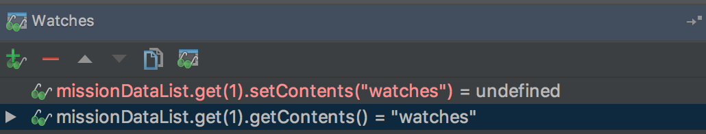 Watches는 break 된 상태에서 코드를 실행할 수 있는 창입니다. 모든 코드를 사용할 수 있는 것은 아니고 현재 라인에서 사용 가능한 코드만 쓸 수 있습니다. + 버튼을 눌러 확인하고 싶은 코드를 입력하면 결과를 바로 확인할 수 있습니다.