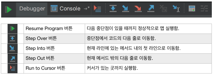 아래 이미지는 디버깅 탭입니다. 각 버튼의 기능을 알아볼까요?