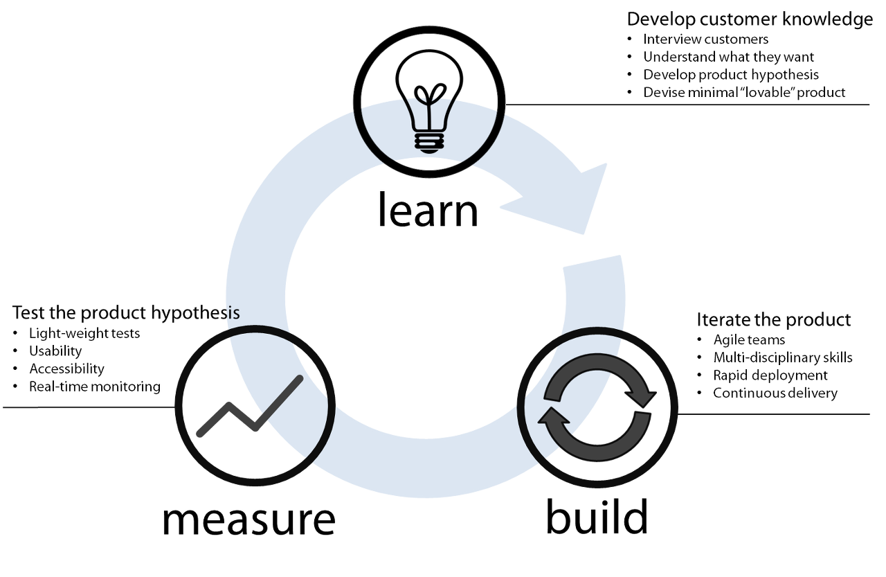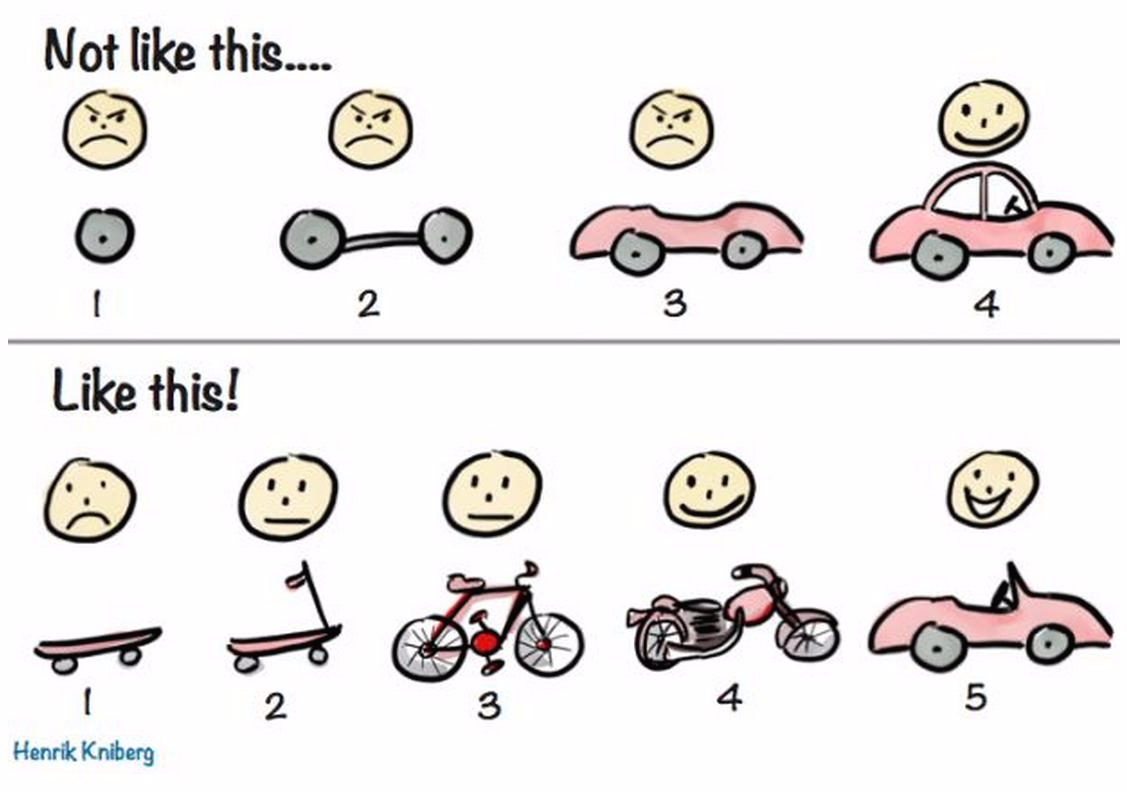 위 그림처럼, 워터폴 방법론 프로세스 에서는 바퀴, 차대, 카울 등의 단계를 차근차근 순차적으로 진행하여 완벽한 최종 제품 or 서비스인 자동차를 만들어 시장에 내놓는 방식이었고, 린스타트업의 프로세스는 보드, 킥보드, 자전거, 오토바이 등의 작은 단계마다 고객에게 가치를 제공할 수 있는 결과물로 시장에 내놓고 반응을 살펴가며 최종 결과물로 만들어가는 방식이라 할 수 있다. 기껏 자동차를 만들어 놨어도 팔리지 않으면 허사니까 작은 단계마다 시장을 즉시 접하고 파악하여 리스크를 줄이는데 목적이 있다.