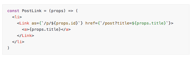 <Link> 엘리먼트에서 "as"라는 또다른 prop를 사용하였습니다. 이는 브라우저에서 보여질 URL입니다. 애플리케이션에 표시되는 URL은 "href" prop에 지정되어 있습니다.