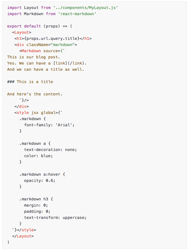 때때로 하위 컴포넌트 안의 스타일을 바꿔야 합니다. 일례로 React에서 마크다운을 사용하는 경우가 있습니다. post 페이지(pages/post.js)에서 볼 수 있습니다.