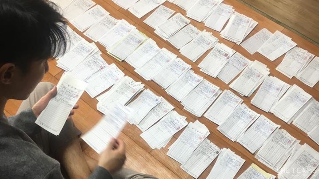 종이 영수증을 취합하여 공급업자 별로 분류, 수기 합산을 통해