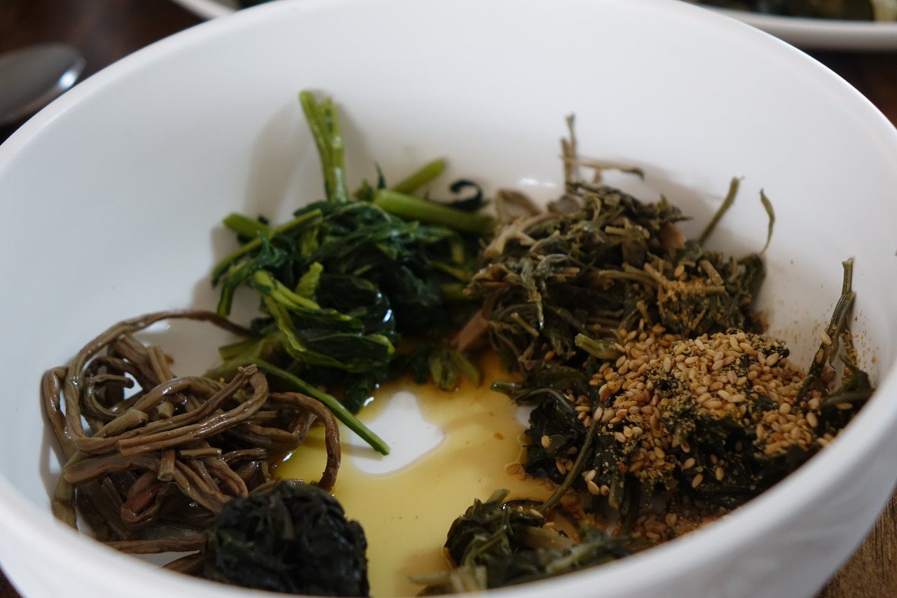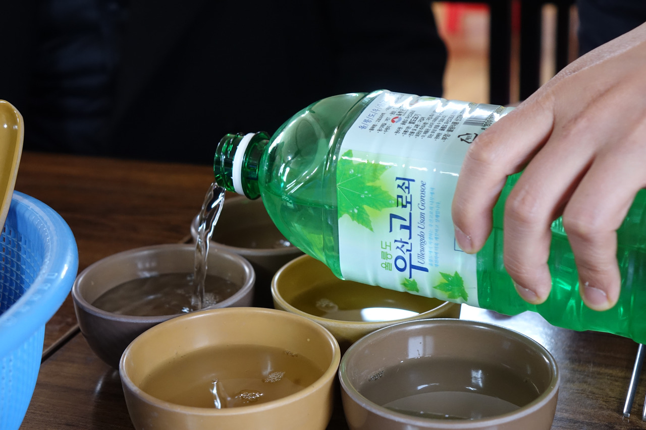 나리분지에 늦은 오후에 도착해서야 제대로 된 첫 식사를 하게 되었습니다. 이른 새벽부터 서울에서 울릉도까지 오느라 아침과 점심을 제대로 먹지 못했기 때문입니다. 메뉴는 울릉도의 다양한 산지 나물들을 골고루 먹을 수 있는 산채비빔밤입니다. 울릉도 토박이 병호님이 찬으로 나온 나물 이름을 하나씩 알려주셔서, 나물 본연의 맛을 더 음미하며 먹어볼 수 있었습니다. 그리고 이 식당에서는 특이하게 생수 대신 고로쇠를 주셔서, 달달한 물맛도 먹어볼 수 있었습니다. 실제로 밥을 먹고 나서 산책했던 숲에서 고로쇠와 산나물을 채취하는 모습을 종종 만나볼 수 있었는데, 이러한 자연 자원들은 울릉도 지역 주민들의 주요 수입원 중의 하나이기도 합니다. 하지만 울릉도의 특색 있는 자연 자원들은 멸종의 위기에 처해있기도 합니다. 산채비빔밥을 먹으며, 천천히 '지속가능성'이라는 단어도 곱씹어보았습니다.
