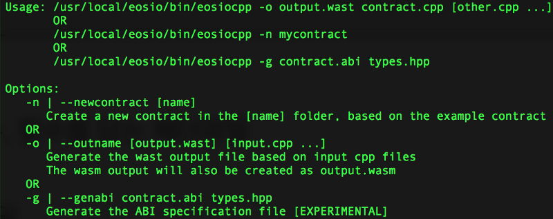 eosiocpp 를 통해 소스코드를 컴파일 해보겠습니다. eosiocpp 는 WASM 및 ABI 컴파일러 로써 블록체인에 업로드 되는 .wasm, .wast, .abi 파일을 생성합니다. 또한 기본 스켈레톤 파일을 제공합니다