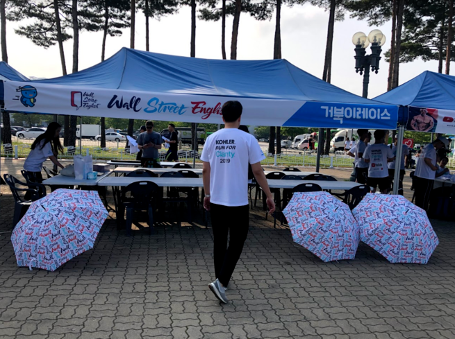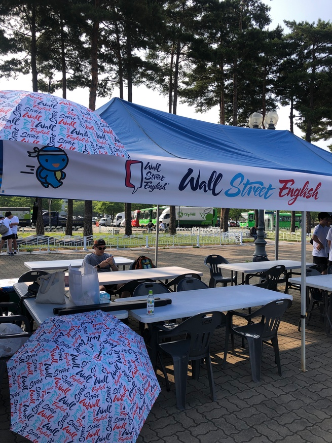 저희의 트레이드 마크인 월스트리트 잉글리쉬 로고를 사용한 대형 우산을 비치했고, 참가한 직원들이 그늘에서 편하게 음료수를 마쉬고 쉴 수 있도록 테이블 설치도 모두 완료 되었습니다. 특히 이 날은 월스트리트 잉글리쉬를 알아보신 많은 참가자분들께서 혹시 우산을 구매할 수 있는지에 대해 문의를 주시는 해프닝이 계속 있었다고 하네요 :-) 아무래도 시~원해보이는 월스트리트 잉글리쉬의 로고 디자인 덕분인 것 같습니다.