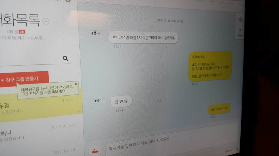 응대에 사용한 옐로아이디 관리자 툴지금은 플러스친구로 업데이트된 카카오톡 옐로아이디 관리자 툴을 활용하여 사용자들과 대화(채팅)를 진행했다. 데스크탑용 웹 인터페이스를 통해 대화를 입력할 수 있었기에 입력 속도는 빨랐지만 사용자가 언제 무슨 말을 걸어올지 도저히 예측이 불가능했다. 팀 내 개발자들이 자연어 처리에 대한 공부를 지속하는 동안 운영을 맡은 팀원과 함께 2명이서 상시 대기하며 사용자들의 요청에 응대했다.