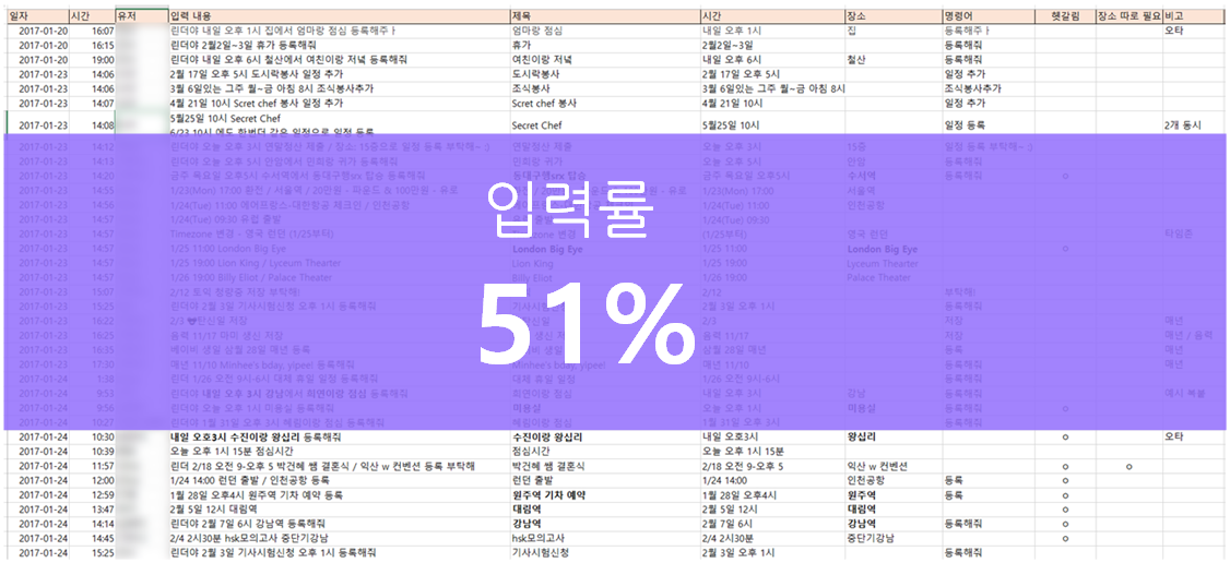 우선 가장 중요하게 생각한 전체 캘린더 일정 입력률(데스크탑/모바일 캘린더를 포함한 모든 입력) 대비 카톡을 통한 일정 입력률은 약 절반 정도로 확인되었다.