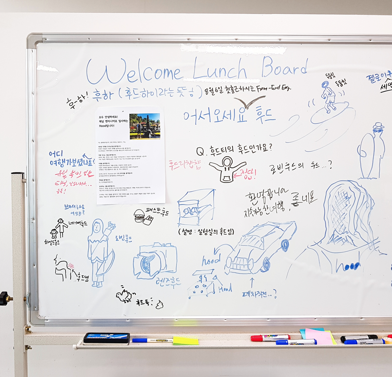 신입 멤버를 맘껏 환영해 주면서, 호스트도 부담을 느끼지 않을 수 있는 방법은 없을까? 고민을 거듭하다 모두가 오가며 볼 수 있는 화이트보드를 활용해 웰컴런치보드를 만들어 보기로 했다.