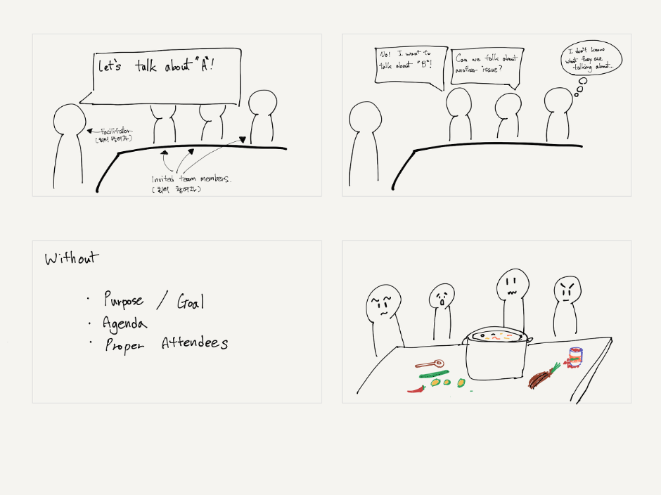 너무 많은 주제와 목표, 참여자는 국물맛을 망칠 뿐이죠!회의를 만들기 전 “왜 회의를 해야 하는 건지, 목적과 얻고자 하는 것은 무엇인지”에 대해 회의 발의자는 명확하게 설정하고 진행할 수 있어야 합니다.