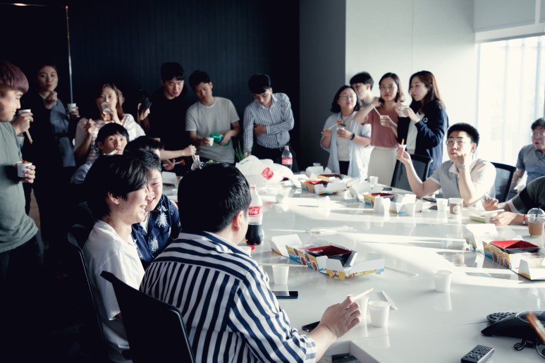 오밀조밀 모여앉은 크루들. 오늘은 치킨입니다. (중요)