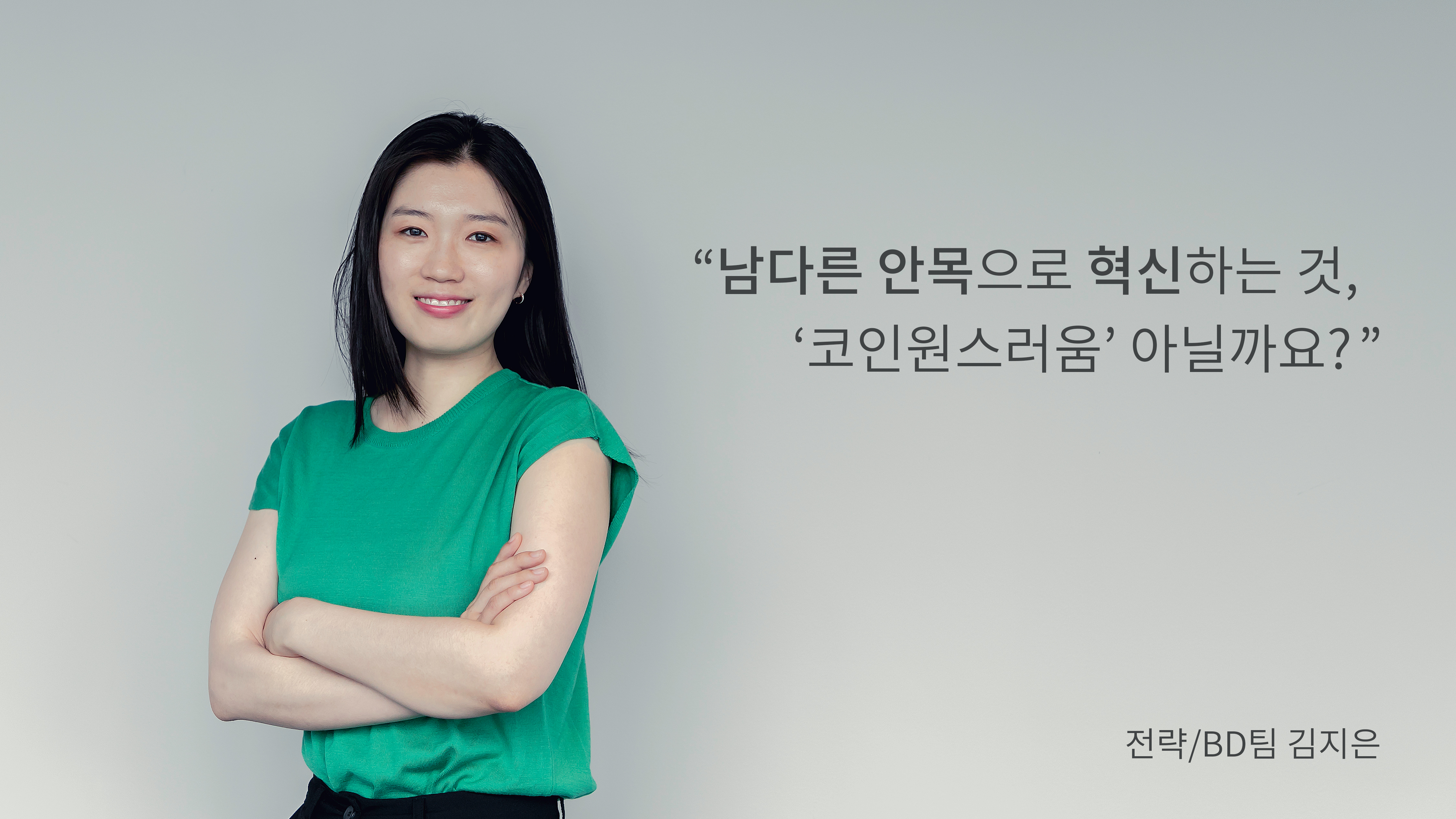 지은 : 안녕하세요, 전략/BD팀에서 일하고 있는 김지은입니다. 암호화폐의 가치를 실질적으로 전달할 수 있도록 사업전략을 기획하고 있어요.