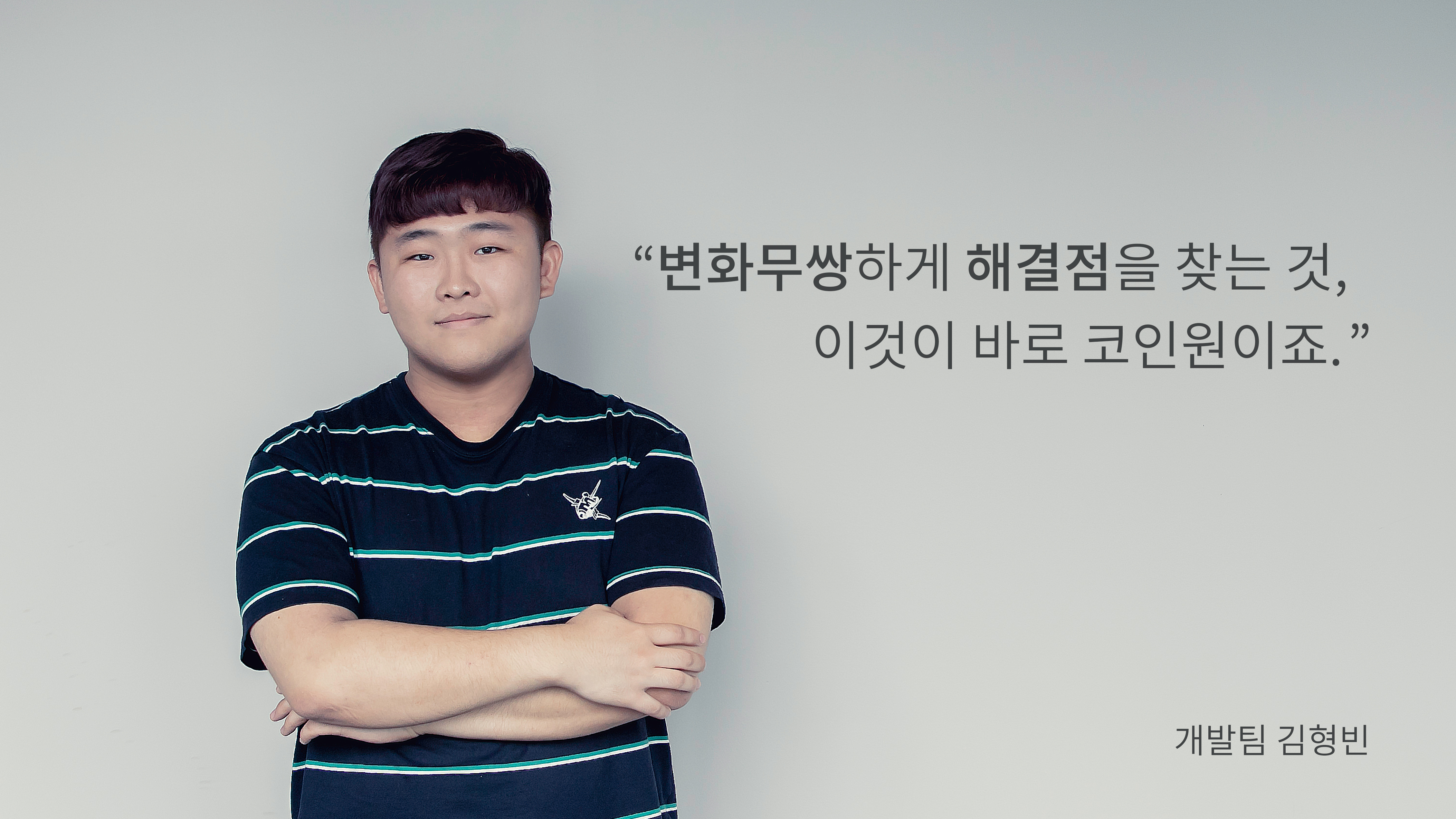 형빈 : 코인원을 접하게 된건 페이스북 채용공고였어요. 저는 대학교에서 배운 것을 토대로 실무경험을 발휘하고 싶었는데요. 코인원 채용공고를 보시면 아시겠지만 위트있고 스타트업스러움이 남달랐답니다. 그래서 제가 즐겁게 원하던 일을 해나갈 수 있을 것 같았어요. 몇 달 인턴할 생각으로(?) 들어왔는데, 지금 코인원에서 열심히 웹 개발을 하고 있네요. 결론은 대표님 사랑합니다.