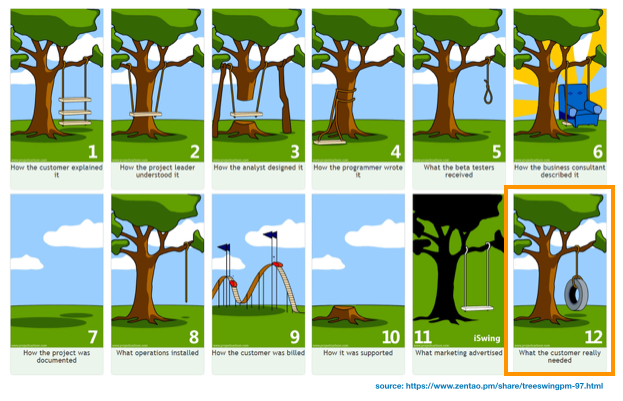 제가 재밌는 그림을 소개할게요. PM직무에 계신 분들에게는 유명한 그림일거에요. 실제로 나와야 할 프로덕트는 12번인데, 프로덕트를 만들기까지 11가지의 시선이 존재한다는 내용입니다. 각자 프로덕트를 바라보는 시각의 차이가 너무 큰거죠.