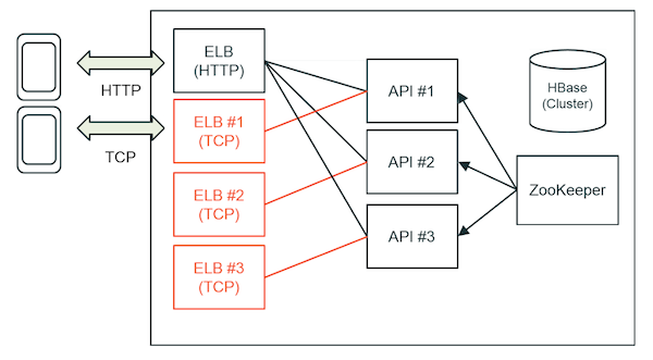 - 클라이언트는 샤딩 정보를 바탕으로 특정 서버로 TCP연결을 맺게 되는데, 이를 위해 각 서버에 ELB가 하나씩 붙습니다. 어떤 서버로 연결을 맺어야 할지는 HTTP 혹은 TCP 프로토콜을 통해 알게 됩니다.