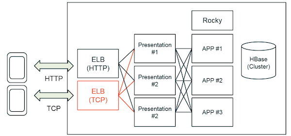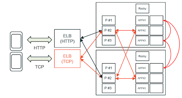 - HTTP 요청은 하나의 ELB를 통해 여러 서버로 분산됩니다. 일반적인 ELB+HTTP 아키텍처와 동일합니다.