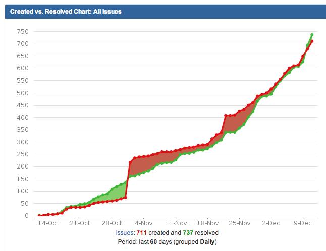 JIRA는 Atlassian에서 만든 이슈 관리 및 프로젝트 관리 도구입니다. VCNC 개발팀에서는 비트윈과 관련된 다양한 프로젝트들의 이슈 관리를 위해 JIRA를 적극적으로 활용하고 있습니다. 제품에 대한 요구사항이 생기면 일단 백로그에 넣어 두고, 3주에 한 번씩 있는 스프린트 회의에서 요구사항에 대한 우선순위를 결정합니다. 그 후 개발자가 직접 개발 기간을 산정한 후에, 스프린트에 포함할지를 결정합니다. 이렇게 개발팀이 개발에 집중할 수 있는 환경을 가질 수 있도록 하며, 제품의 전체적인 방향성을 잃지 않고 모두가 같은 방향을 향해 달릴 수 있도록 하고 있습니다.