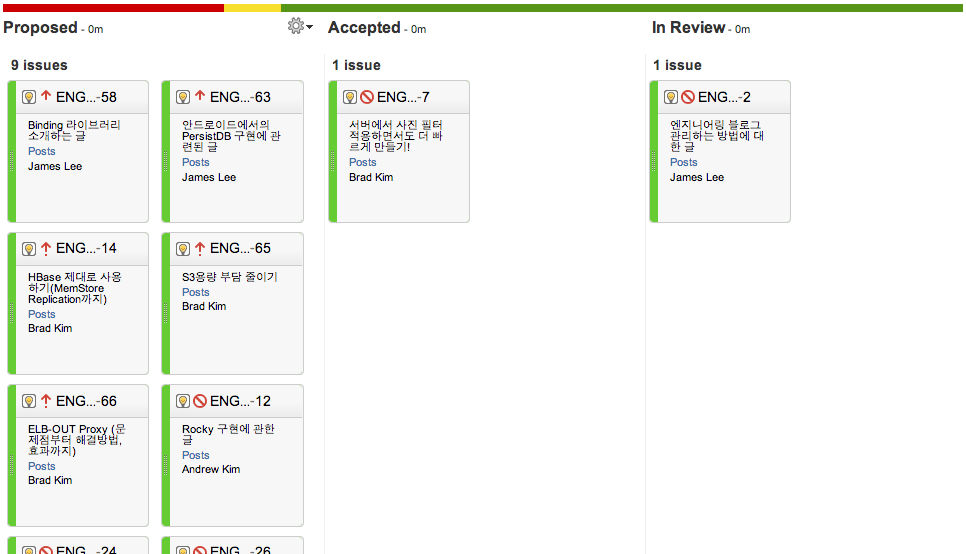 위와 같은 프로젝트 관리를 위한 일반적인 용도 외에도 엔지니어링 블로그 글 관리를 위해 JIRA를 사용하고 있습니다. JIRA에 엔지니어링 블로그 글감을 위한 프로젝트를 만들어 두고 블로그 글에 대한 아이디어가 생각나면 이슈로 등록할 수 있게 하고 있습니다. 누구나 글감 이슈를 등록할 수 있으며 필요한 경우에는 다른 사람에게 글감 이슈를 할당할 수도 있습니다. 일단 글감이 등록되면 엔지니어링 블로그에 쓰면 좋을지 어떤 내용이 포함되면 좋을지 댓글을 통해 토론하기도 합니다. 글을 작성하기 시작하면 해당 이슈를 진행 중으로 바꾸고, 리뷰 후, 글이 발행되면 이슈를 해결한 것으로 표시하는 식으로 JIRA를 이용합니다. 누구나 글감을 제안할 수 있게 하고, 이에 대해 팀원들과 토론을 하여 더 좋은 글을 쓸 수 있도록 돕기 위해 JIRA를 활용하고 있습니다.