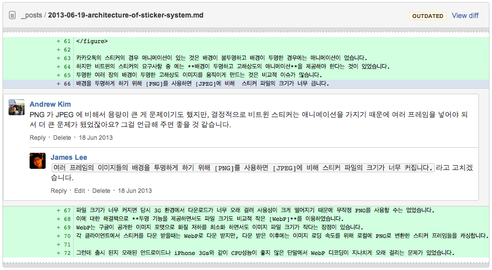 업무상 코드 리뷰 뿐만 아니라 새로운 블로그 글을 리뷰하기 위해 Pull request를 활용하고 있습니다. 어떤 개발자가 글을 작성하기 위해서 가장 먼저 하는 것은 블로그를 관리하는 Git 리포지터리에서 새로운 브랜치를 따는 것입니다. 해당 브랜치에서 글을 작성하고 작성한 후에는 새로운 글 내용을 push한 후 master 브랜치로 Pull request를 날립니다. 이때 리뷰어로 등록된 사람과 그 외 개발자들은 내용에 대한 의견이나 첨삭을 댓글로 달 수 있습니다. 충분한 리뷰를 통해 발행이 확정된 글은 블로그 관리자에 의해 master 브랜치에 머지 되고 비로소 발행 준비가 끝납니다.