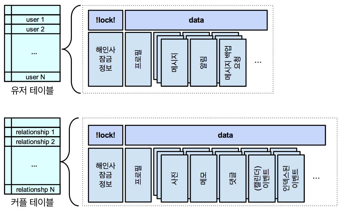 또한, 관련된 데이터를 하나의 Row에 모아 저장합니다. 특정 커플과 관련된 사진, 메모, 사진과 메모에 달린 댓글, 기념일 등의 데이터는 해당 커플과 관련된 하나의 Row에 저장됩니다. Haeinsa를 위한 Lock Column Family를 제외하면, 데이터를 저장하기 위한 용도로는 단 하나의 Column Family만 만들어 사용하고 있습니다.
