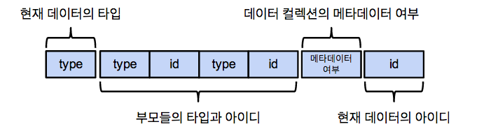 이렇게 특정 타입의 자식들을 연속하게 모아 저장하는 묶음을 컬렉션이라고 합니다. 컬렉션에는 컬렉션에 저장된 자식들의 개수나 새로운 자식을 추가할 때 발급할 아이디 등을 저장하는 Metadata가 있습니다. 이 Metadata도 특정 Column에 저장되므로 Metadata를 위한 Column Qualifier가 존재합니다. 이를 위해 Column Qualifier에는 Column Qualifier가 자칭하는 데이터가 Metadata인지 표현하는 필드가 있는데, 특이하게도 메타데이터임을 나타내는 값이 1이 아니라 0입니다. 이는 Metadata가 컬렉션의 맨 앞쪽에 위치하도록 하기 위함입니다. 컬렉션을 읽을 때 보통 맨 앞에서부터 읽는 경우가 많고, 동시에 Metadata에도 접근하는 경우가 많은데, 이 데이터가 인접하게 저장되어 있도록 하여 Block Cache 적중이 최대한 일어나도록 한 것입니다.