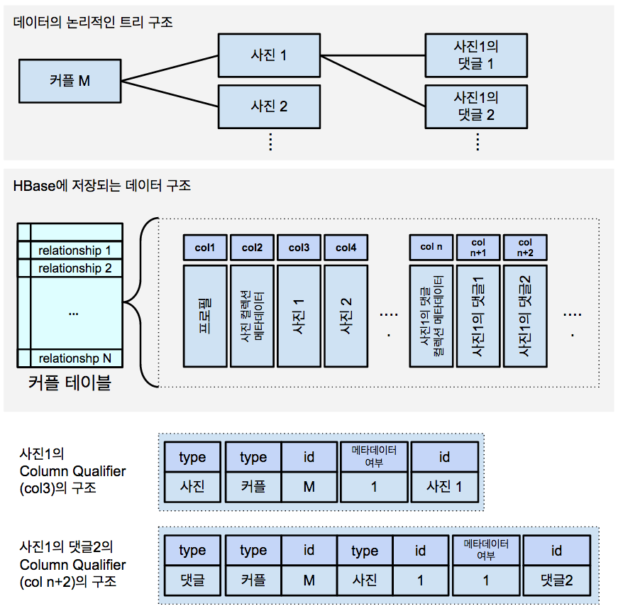 비트윈은 커플들이 올린 사진 정보들을 저장하며, 또 사진들에 달리는 댓글 정보들도 저장합니다. 한 커플을 Root라고 생각하고 커플 밑에 달린 사진들을 커플의 자식 데이터, 또 사진 밑에 달린 댓글들을 사진의 자식 데이터라고 생각한다면, 비트윈의 데이터들을 논리적으로 트리 형태로 생각할 수 있습니다. 비트윈 개발팀은 Column Qualifier를 잘 정의하여 실제로 HBase에 저장할 때에도 데이터가 트리 형태로 저장되도록 설계하였습니다. 이렇게 트리 형태로 저장하기 위한 Key구조에 대해 자세히 알아보겠습니다.