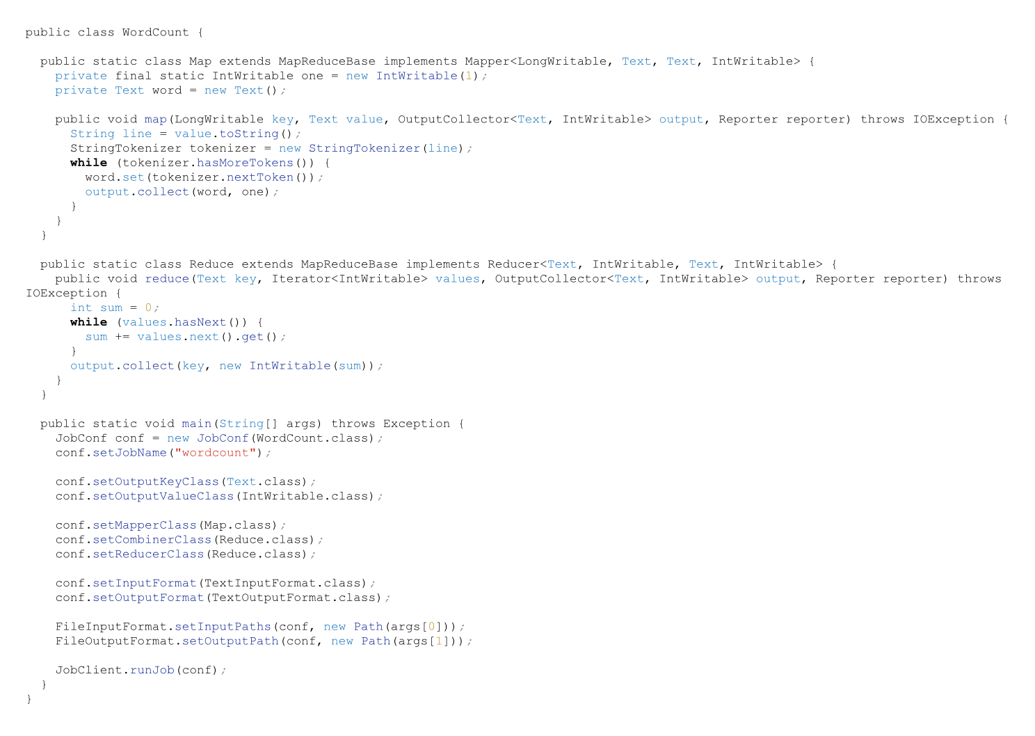 MapReduce는 슈퍼컴퓨터 없이도 저렴한 서버를 여러 대 연결하여 빅데이터 분석을 가능하게 해 준 혁신적인 기술이지만 10년이 지나니 여러 가지 단점들이 보이게 되었습니다. 우선 과도하게 복잡한 코드를 짜야합니다. 아래는 간단한 Word Count 예제를 MapReduce로 구현한 것인데 매우 어렵고 복잡합니다.