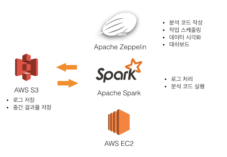 | 일일 배치 분석 | 코드 작성 및 관리가 어려움 | Zeppelin의 Schedule 기능을 통해 수행 Interactive shell로 쉽게 데이터를 탐험 오류가 생긴 경우에 shell을 통해 손쉽게 원인 발견 및 수정 가능 |
