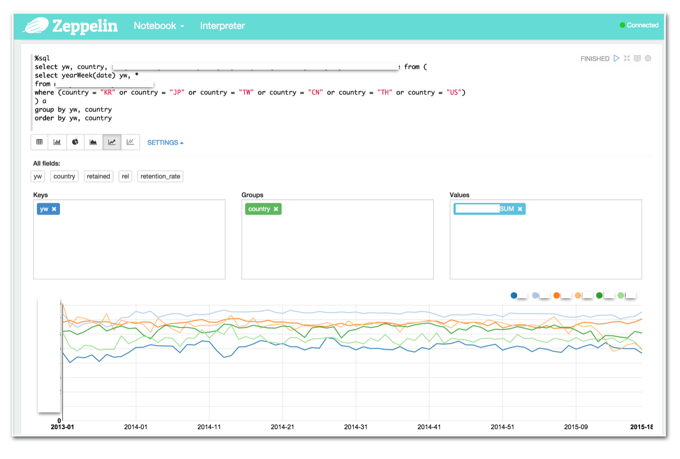 Apache Zeppelin은 국내에서 주도하고 있는 오픈소스 프로젝트로써, Spark를 훨씬 더 편하고 강력하게 사용할 수 있게 해주는 도구입니다. 주요한 역할은 노트북 툴, 즉 shell에서 사용할 코드를 기록하고 재실행할 수 있도록 관리해주는 역할과 코드나 쿼리의 실행 결과를 차트나 표 등으로 시각화해서 보여주는 역할입니다. VCNC에서는 Zeppelin의 초기 버전부터 관심을 가지고 살펴보다가, Apache Spark를 엔진으로 사용하도록 바뀐 이후에 활용성이 대폭 좋아졌다고 판단하여 데이터 분석에 Zeppelin을 도입하여 사용하고 있고, 개발에도 참여하고 있습니다.