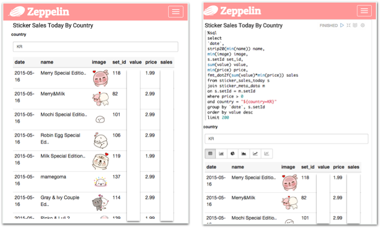 | Dashboard | 별도의 사이트를 제작하여 운영 관리가 어렵고 오류 대응 힘듦 | Zeppelin report mode 사용해서 제작 코드가 바로 시각화되므로 제작 및 관리 수월 |