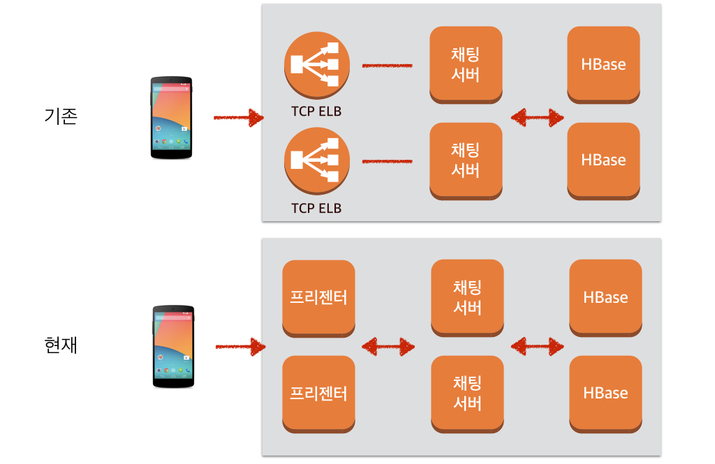 PC버전과 푸시 서버를 만들면서 기존의 채팅 연결과 다르게 많은 수의 연결이 장시간 동안 유지 되는 경우를 처리할 수 있어야 했습니다. 기존에는 TCP 릴레이를 하도록 설정된 ELB가 연결들을 받아주었습니다. 한 머신당 6만 개 정도의 Outbound TCP 연결을 맺을 수 있는데, ELB도 트래픽에 따라 여러 대의 머신에서 돌아가는 일종의 프로그램이므로 이 제한에 걸린다고 생각할 수 있습니다. 따라서 많은 수의 연결을 맺어놓고 있어야 하는 경우 ELB에 문제가 생길 수 있다고 판단했습니다. (과거 ELB가 연결 개수가 많아지는 경우 스케일아웃이 안되는 버그 때문에 문제가 된 적이 있기도 했습니다) 또한 클라이어트 연결당 내부 연결도 하나씩 생겨야 하면 클라이언트가 연결을 끊거나 맺을 때마다 서버 내부 연결도 매번 끊거나 연결해야 하는 오버헤드가 발생합니다.