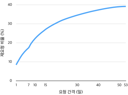 아래의 그래프는 S3 접근 로그를 분석해서 파악한 특정 기간 내에 같은 해상도를 가지는 썸네일을 클라이언트가 한 번 이상 재요청 하는 비율을 나타내는 그래프입니다. 하루 내에 같은 해상도의 사진을 요청하는 경우는 10% 가 되지 않으며, 한 달 안에도 33% 정도에 불과한 것을 알 수 있습니다.