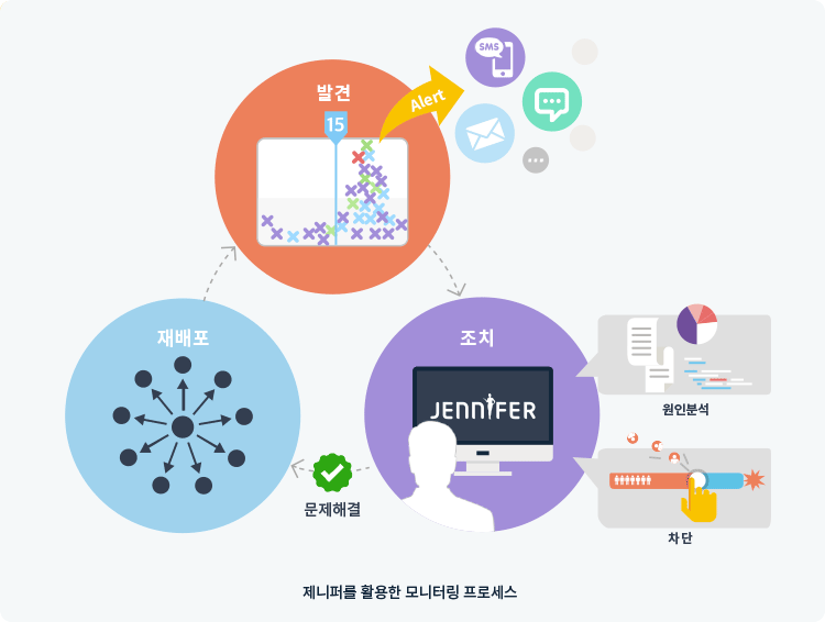 DevOps를 완벽하게 실현하기 위해서는 모니터링 단계에서 서비스 배포 이후의 서버에 들어오는 트랜잭션에 대한 상태를 배포 전과 비교할 수 있어야 하며, 응답을 지연시킬만한 요소들을 빠르게 인지할 수 있어야 한다. 그리고 배포된 소스코드로 인해 서비스 장애가 발생하는 상황이 온다면 이를 처리하기 전까지 어떻게든 서비스 장애를 지연시켜야만 한다. 이러한 이유로 DevOps 진영에서는 APM의 역할은 매우 중요한 이슈이다. 우리는 제니퍼를 통해 앞서 말한 기능들을 활용하는 방법에 대해 알아볼 것이다.