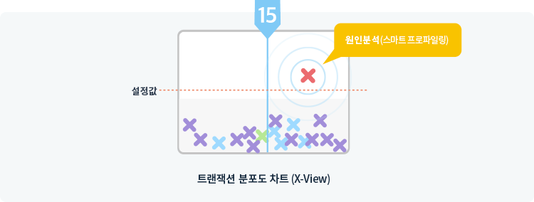 액티브서비스는 처리가 완료되지 않은 상태이므로 서비스 장애의 원인분석을 위한 데이터로는 적합하지 않다. 그렇기 때문에 액티브서비스 개수는 기준 값이 될 수 없으며, 개발자는 처리가 완료된 트랜잭션 데이터의 응답시간을 기준 값으로 제니퍼의 프로파일링 관련 설정을 해야 한다. 설정된 값을 기준으로 트랜잭션 분포도 차트에서 가상의 선을 긋고, 그 선 위에 있는 트랜잭션을 대상으로 스마트 프로파일링 기능을 수행할 수 있다.